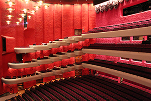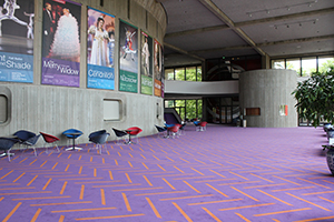 The design inside the theater is typical of European opera houses with no internal isles. The colors of the MAC are original as chosen by the architect who built it more than 40 years ago. The nontraditional pallet of orange, pink and purple creates a very modern and lively environment as you walk into the hall.